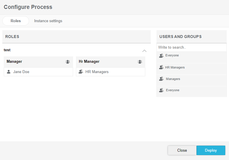 In the example below we have two roles: Manager and Hr Manager. These roles are configured with two groups: Managers and HR Managers.