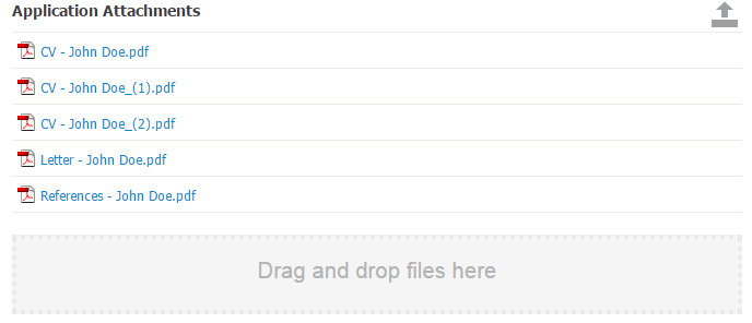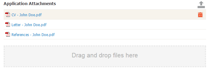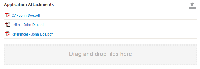 You can upload any kind of file format to the Attachment Folder, but the maximum size of the file should not exceed 20 MB. You can either drag and drop one or more files onto the grey section at the bottom of the field, or you can upload files by clicking on the upload icon.