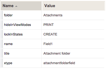 The configuration settings hideInVewModes, hideInStates, lockInViewModes, and lockInStates all work as expected for the Attachment Folder field. By default, the setting hideInViewModes=PRINT is added to the field. The viewMode PRINT is a default viewmode that is used when downloading a form as a PDF (if that option has been activated for the process application). Any fields that have the setting to be hidden in the viewmode PRINT will be hidden in the PDF version of the form. You may remove the settings, but the best practice is to keep the field hidden when printing.