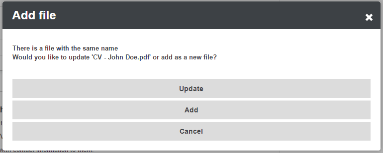 If you choose to add a new file with the same name they will have the suffix _(x) added to the end.