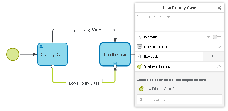 If you have multiple start events in the call activity process model, it is possible to select which start event to trigger by double-clicking the incoming sequence flows. You can select which specific start event in the call activity will be triggered by each sequence flow. It is also possible to have manual start events in the call activity so that the process application can be triggered both by a call activity and manually via the Process Automation standard interface for starting instances. You may find that it is particularly convenient to have a manual start event during testing.