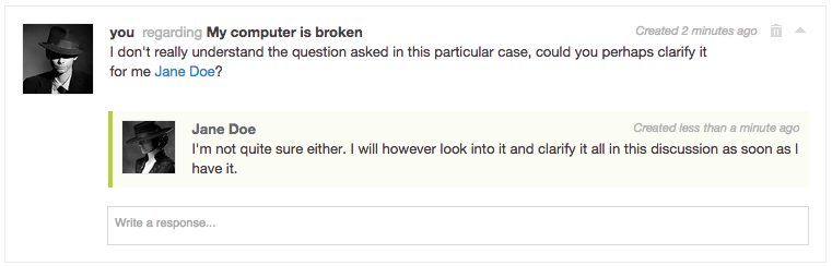 As a user, you can write comments from the task view (if enabled for the participant that you act as) or from the instance view and can either start a new discussion or reply to an existing comment. Apart from the instance itself forms and files can be commented on.