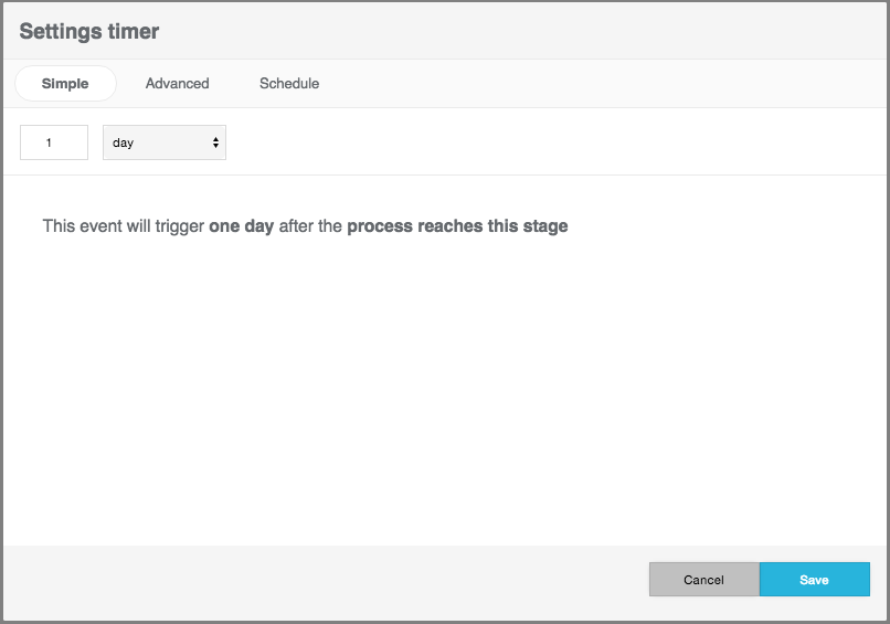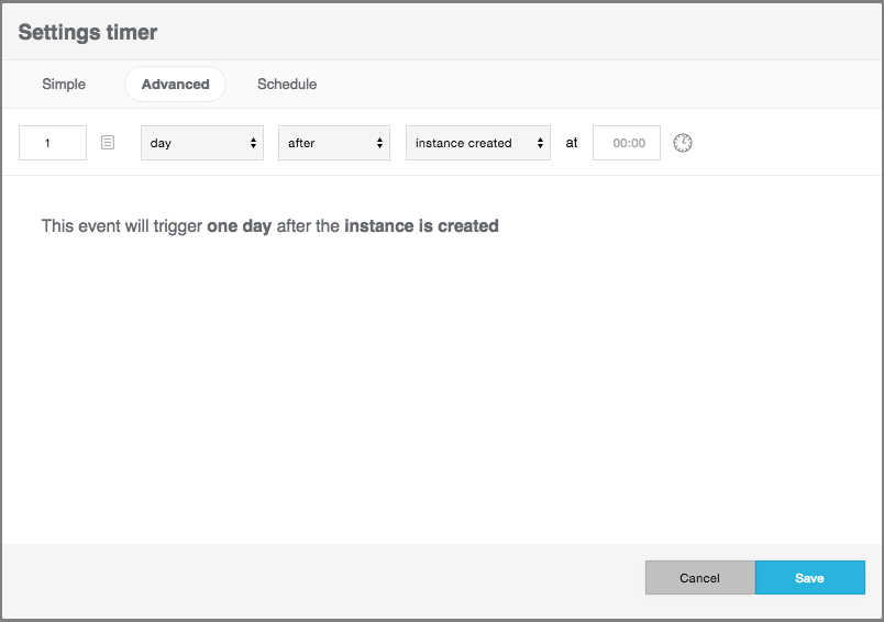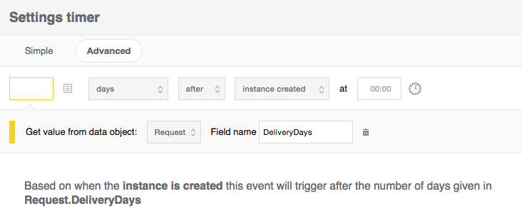 Add timer settings on events to trigger start events, create delays and/or timed breaks according to form variables, relative to other task or instance data, or depending on time schedule.