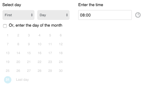In the drop-downs, you can choose first, second, third, fourth, fifth and last day, weekend day, week day or specific week day.