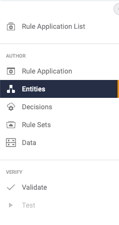 Select a rule application from the Rule Application list. Then select the Entities tab in the menu on the left side.