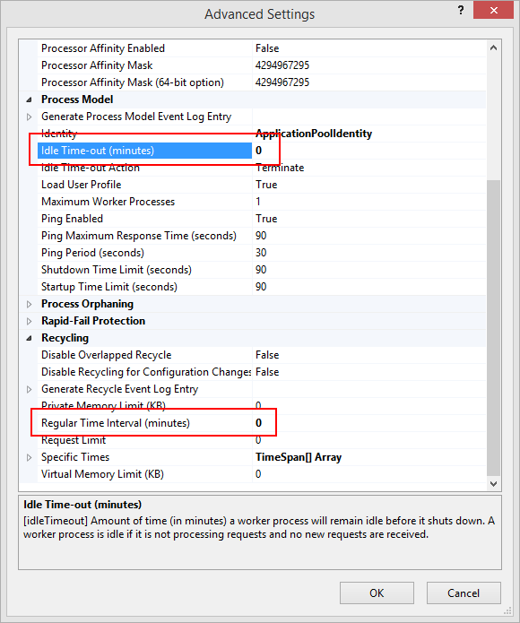 When InRule is hosted inside of an IIS worker process, it is important to note that IIS has built-in features that will occasionally recycle the worker process. Each time the process is recycled, all of the InRule AppDomain caches are also recycled, and cold start costs due to loading assemblies and compiling rule applications must be repaid. Two settings that affect automatic recycling of IIS application pools are the "Idle Time-out" and "Regular Time Interval". Both of these settings should be set to "zero" to avoid regular recycling of the process that is hosting both the InRule rule engine and the irCatalog. The screen shot below shows an example of configuring these settings using the IIS application pool Advanced Settings screen._