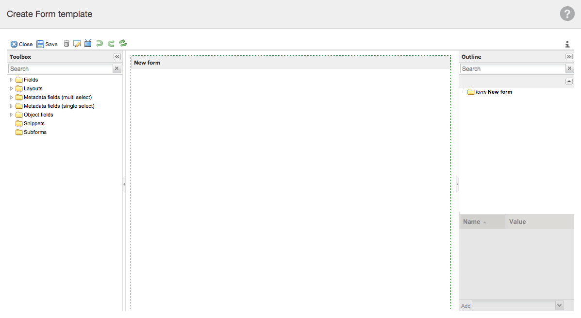 The form's drawing board is located in the middle of the screen. This is where you add the fields that will make up the form. On the left side is the Toolbox, which contains the different fields and objects that are available to you. On the right side, you have the Outline showing you the added form objects, giving you a simple way to select specific objects for configuration. You create your form by dragging fields and objects from your palette and dropping them on the drawing board. Your basic form is built with panels that contain your form fields.