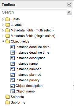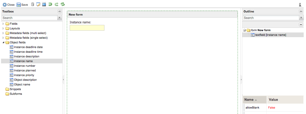 5. It is important to always have one of the available **Object fields** in your form; namely the **Instance name** field. This is a standard text field but the text filled out in this field will give the current instance the name filled into the form.