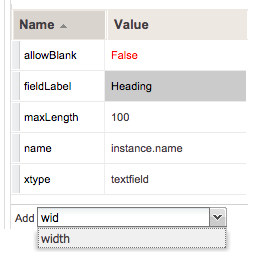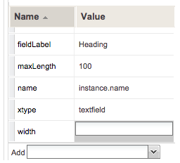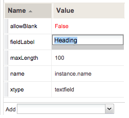 Make sure that the Instance name field is the one you marked. Change the fieldLabel to "Heading" and hit Enter on your keyboard.