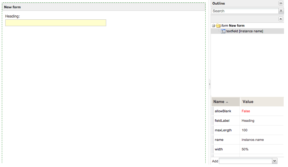 Drag the Instance name field from your palette to your drawing board and drop it anywhere in the New form panel.