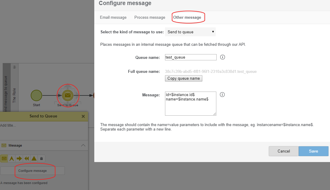 Add a queue name and a message. One example is to use this to retrieve data from a field in a form. You can achieve this by typing $form.field$. Then, select Copy queue name and past it into the agent.xml file (See step 6). Note: Messages that have been fetched from queue will be deleted after 30 days. Messages that have not been fetched from the queue within a year will automatically be deleted.
