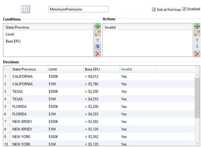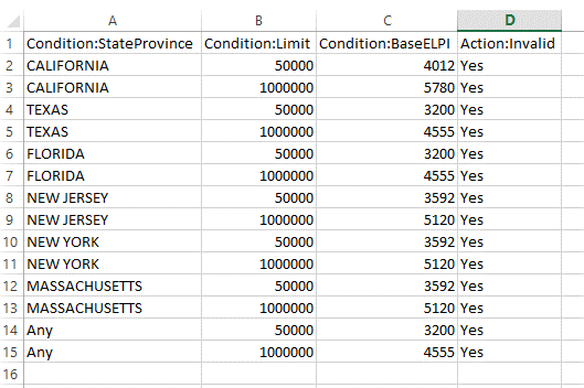 In this example, the Extension will import data from Excel spreadsheet to build a Decision Table in the rule application. The following spreadsheet has been used to determine if the established premium for the insurance policy in a given State or Province is sufficient. If it is not, the policy is invalid.