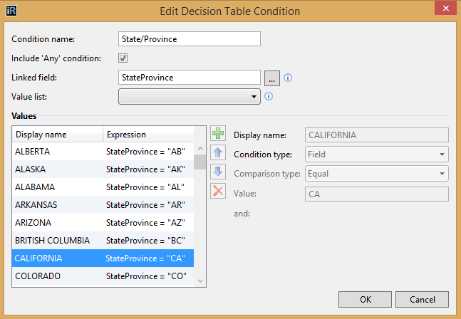 In this example, the first column in the spreadsheet holds the value for the State/Province. Each unique value that appears in that column should be created as an option in your State/Province condition. The screenshot below shows what that condition would look like in irAuthor: the condition has a recognizable name, maps to a field in the authoring model, and consists of all of the valid options the rule author can then select.