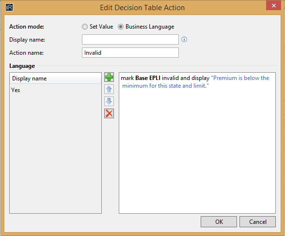 Next, you need to add your Actions. While a Decision Table can support multiple Actions, in this example, there is only one called "Invalid". The Actions are built in a very similar manner as the Conditions. The Action will simply mark the entire policy Invalid when the premium is too low.