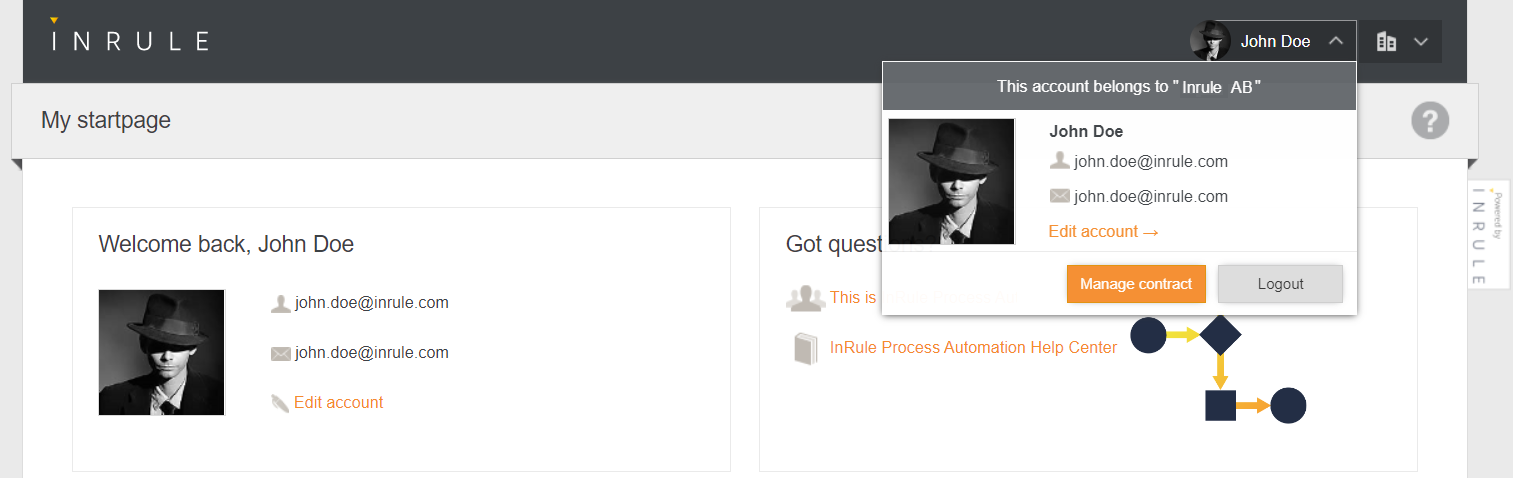 My Startpage can be found in the spaces menu in the top right corner. This is where you see information about your account. In the Got Questions section, you can find links to the Help Center and an opportunity to get in contact with Process Studio experts.