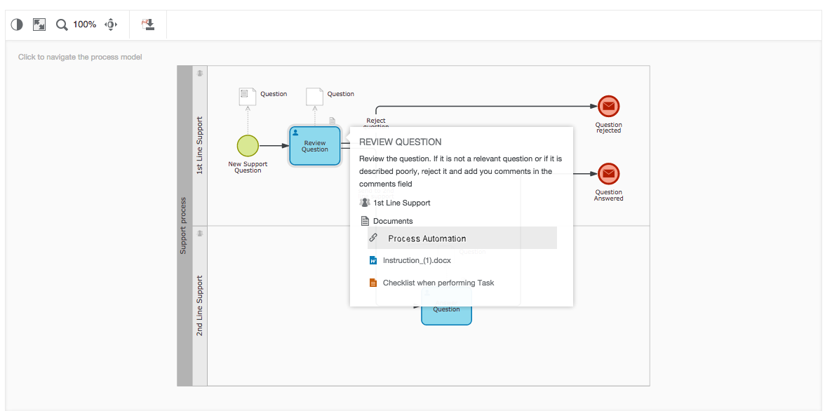 Use the external weblink to share your process models to consumers without Process Automation accounts or show the models on your intranets. Everyone with the url can access the process model with its links and documents according to other secondary access settings.