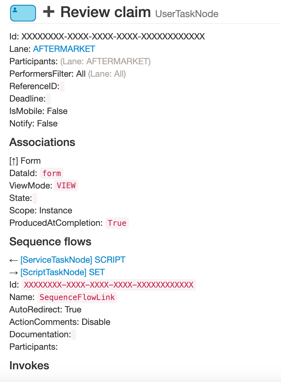Process elements The configuration of all process elements is shown. If a form or message is associated with the task that information can be viewed here.