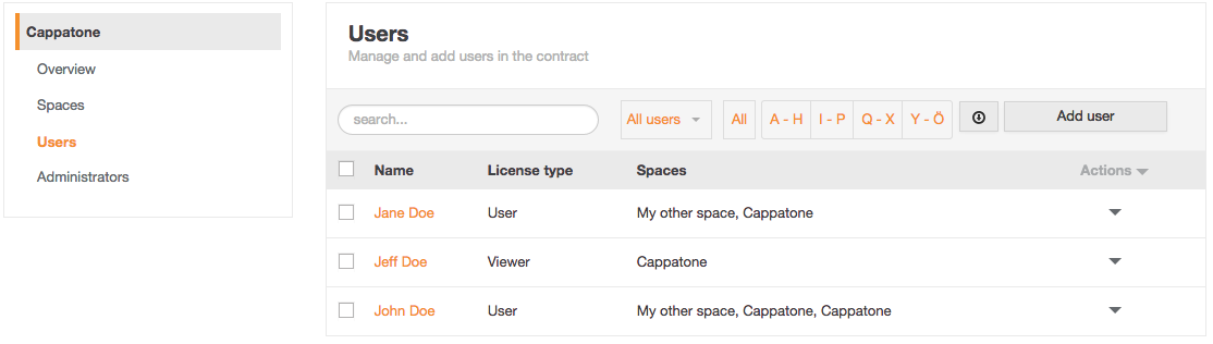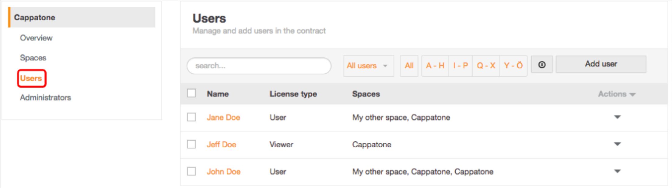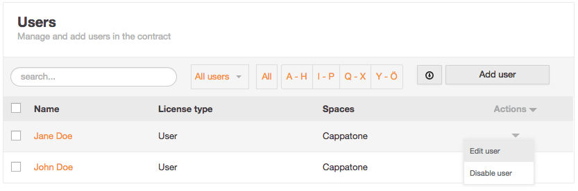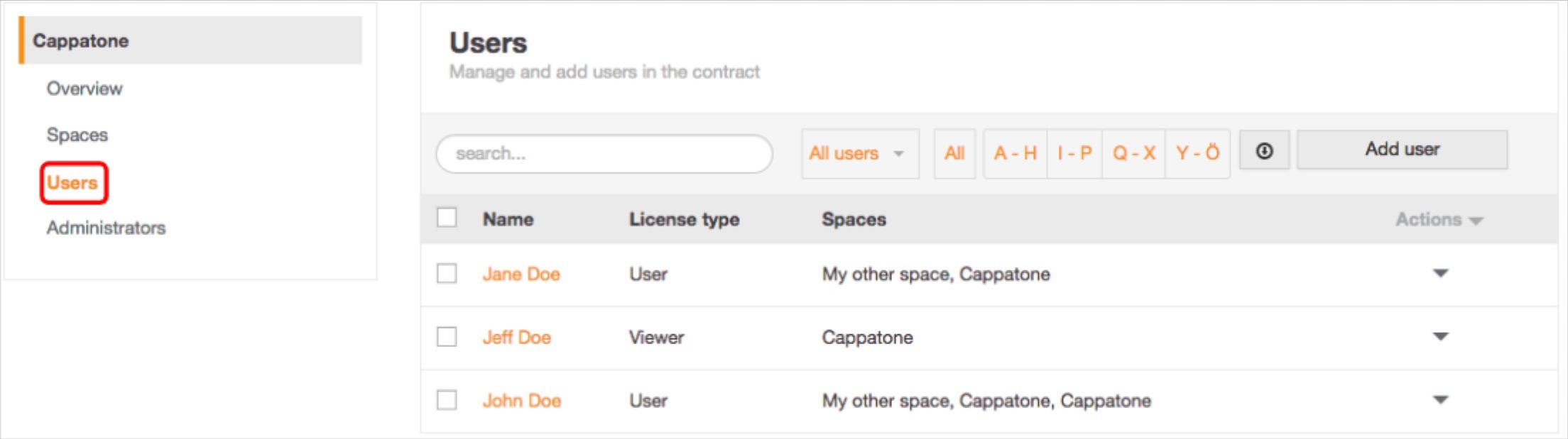 All users that are included in a Contract are listed in the Manage contract functionality under Users.