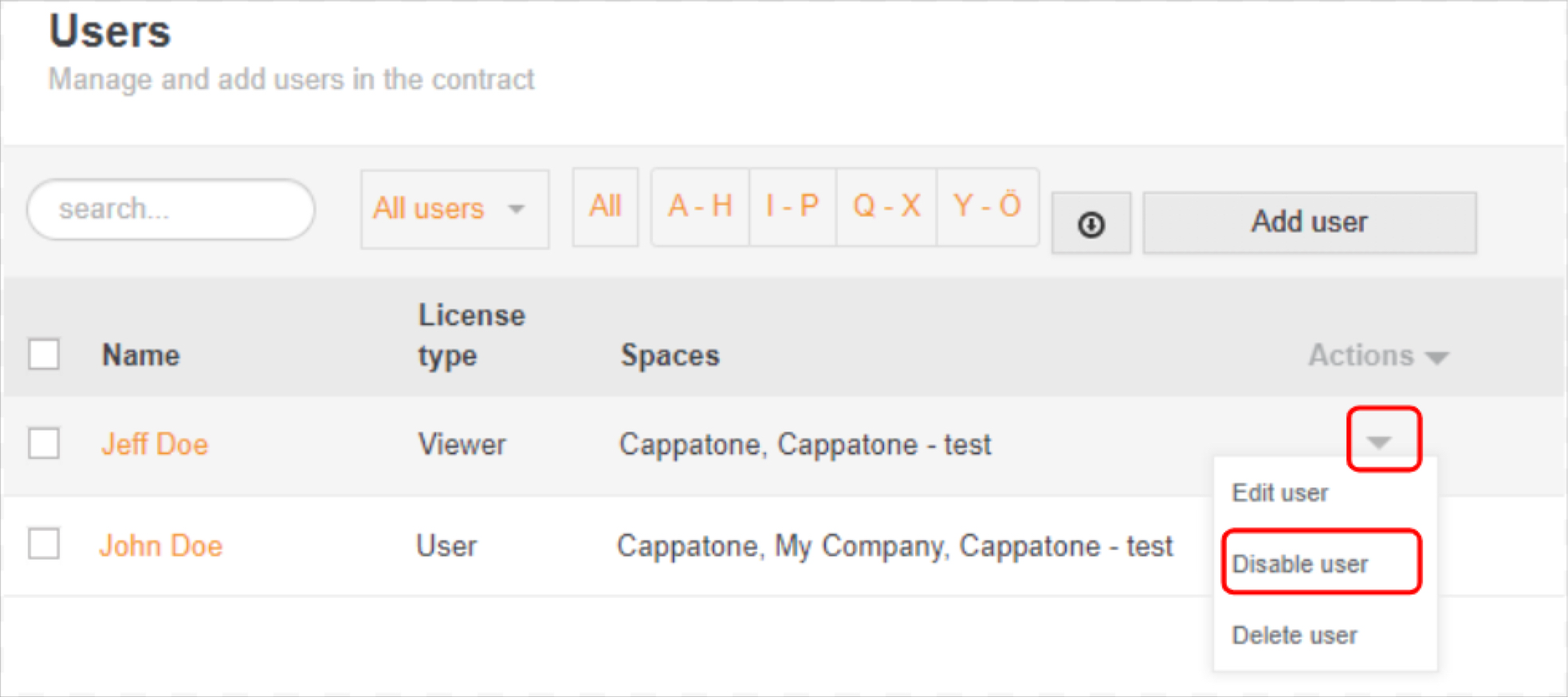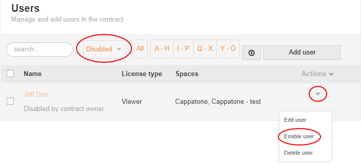 A Disabled user account does not consume a license but is still connected to the contract. You can find all of the Disabled user accounts by applying the filter Disabled.