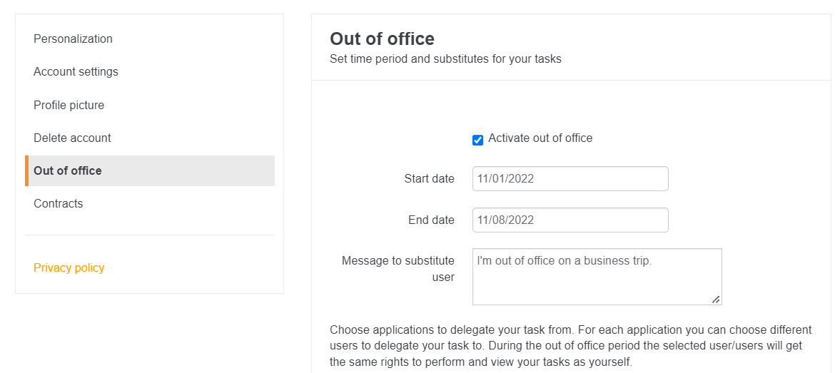If a user can not perform their tasks because they will not be working for a given amount of time, the Out of office function makes it possible for a performer to delegate their tasks to another specified substitute performer.