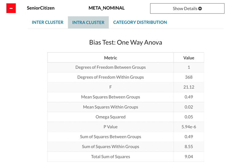 Newly added to Bias Testing, this test runs an Analysis of Variance statistical test. This test determines if the distribution of query prediction confidence scores within a cluster are different for records with other values of the variable being tested.