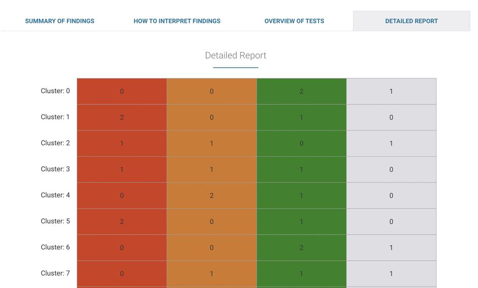 Bias Detection Report makes Intracluster and Intercluster Bias Detection queries for a selected set of variables across all clusters in a model and returns the results in an easy-to-digest interface for review. The Bias Detection Report is accessed through the Model Actions page for any Supervised Clustering Model.