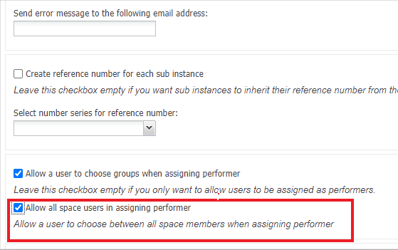 Scroll down until you see the checkbox Allow all space users when assigning performer.