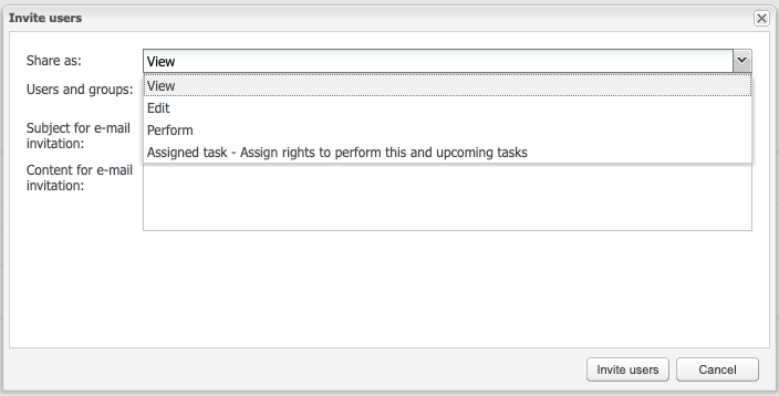 If you need to include other users in a task that you are responsible for, you can use the share task function to allow other users to collaborate with you. You can invite users to your task with different permissions: View, Edit, Perform, or Assign. This function may be useful if you need input from a colleague or if you are unable to perform your task.