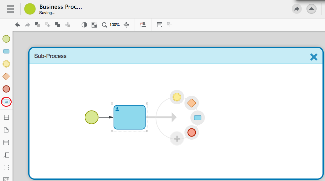 Model your subprocess within the enabled window, just the way you normally model with a start task and end symbol. Then close the subprocess window by using the x-sign in the top right.