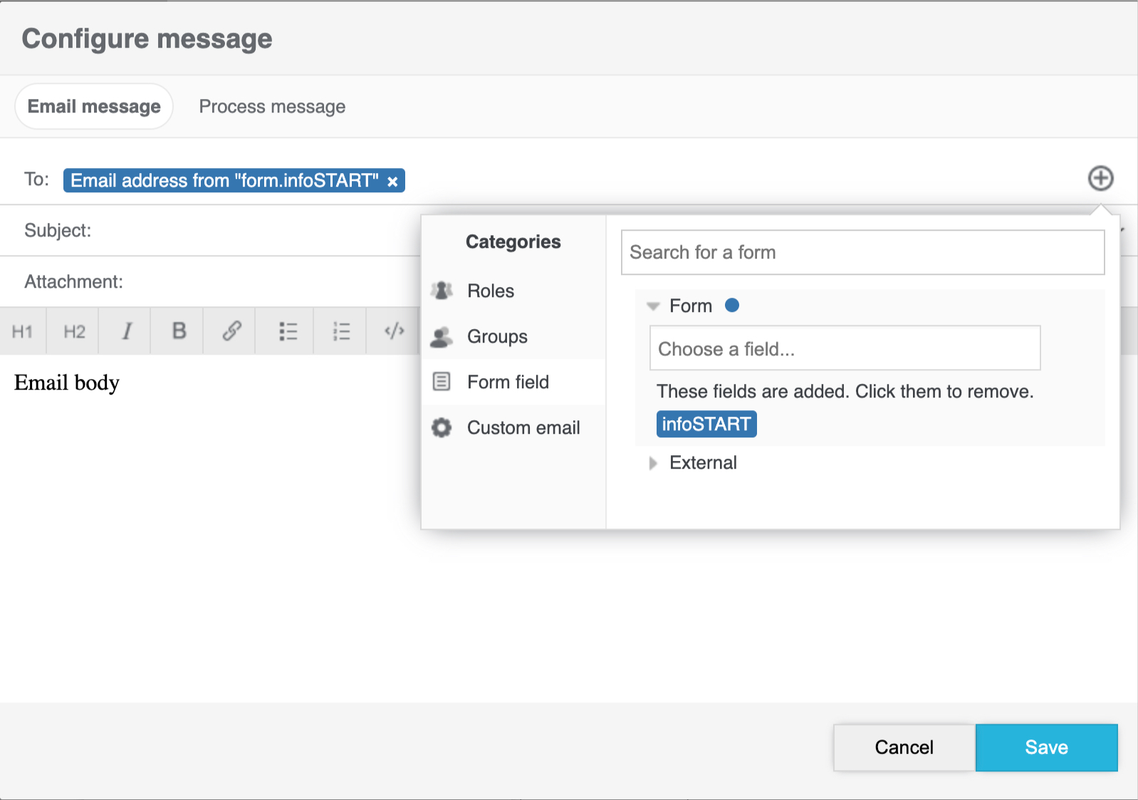 If the form configuration is not matching the definition. This could be that the fields of the form were updated and the field name you chose does not match the one currently on the form. You can check this by going to the form, checking the name of the field, and making sure it matches. In the configure message, try deleting the name of the field and reselecting it in the configuration again. Also, check that the input email in the related field is correct and no spelling errors are made.