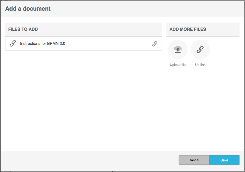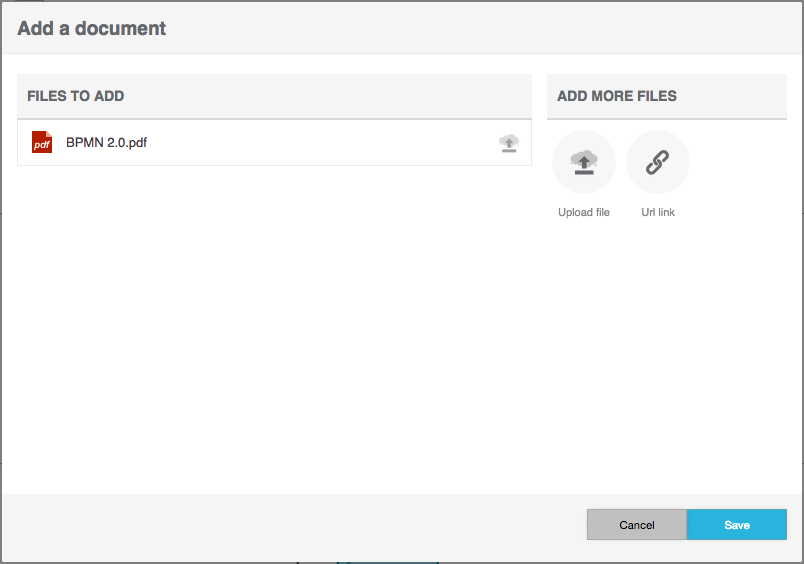 Once selected, the file is visible in the Add a document window. From this window, you can add more files before saving and uploading them. When you are done adding files click Save.